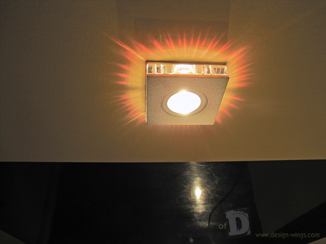 Коридор нас встречает удобными шкафами, один из которых задействован под пуфик для сидения и снятия обуви. Подвесной гипсокартонный потолок зонально опущен для размещения светильников, а все оставшееся пространство было оформлено с применением техники натяжного акрилового потолка, благодаря глянцевой поверхности которого достигнуто визуальное увеличение высоты.